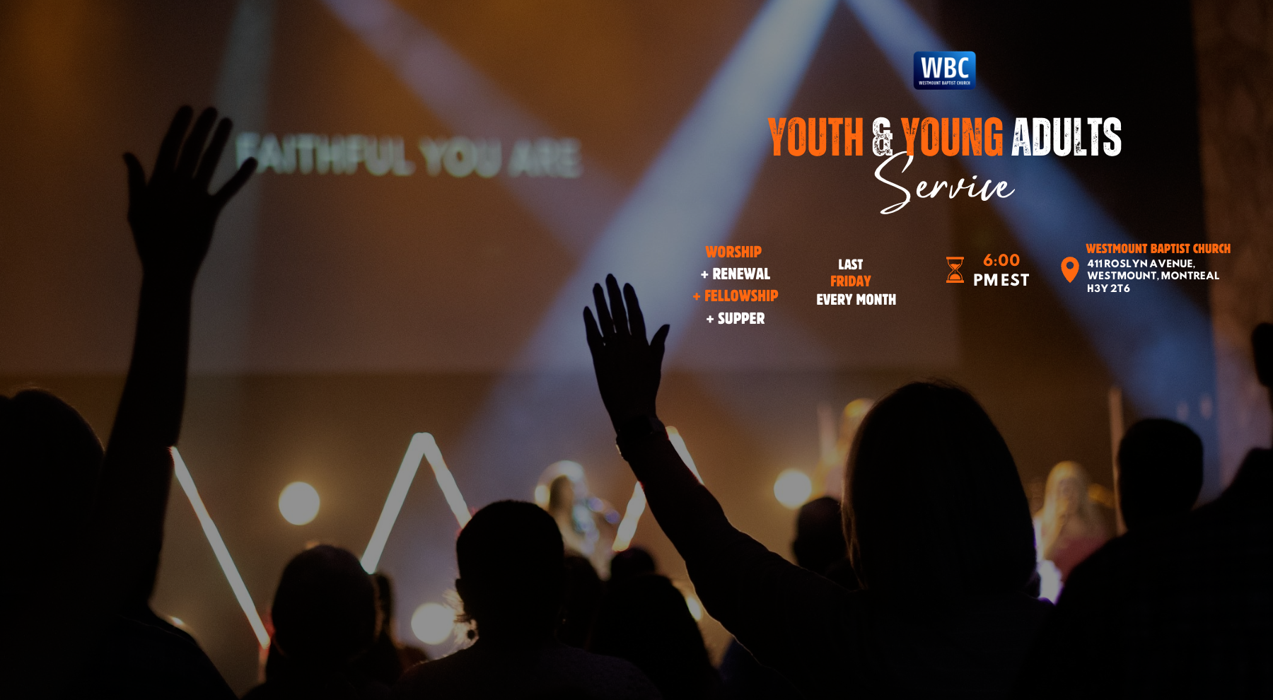 You and your plus one (yes โ bring a friend! ๐๐พ) are warmly invited to WBCโs Youth & Young Adults Service this Friday, April 24th at 6:00 PM in the main church auditorium! ๐๐๏ธ
